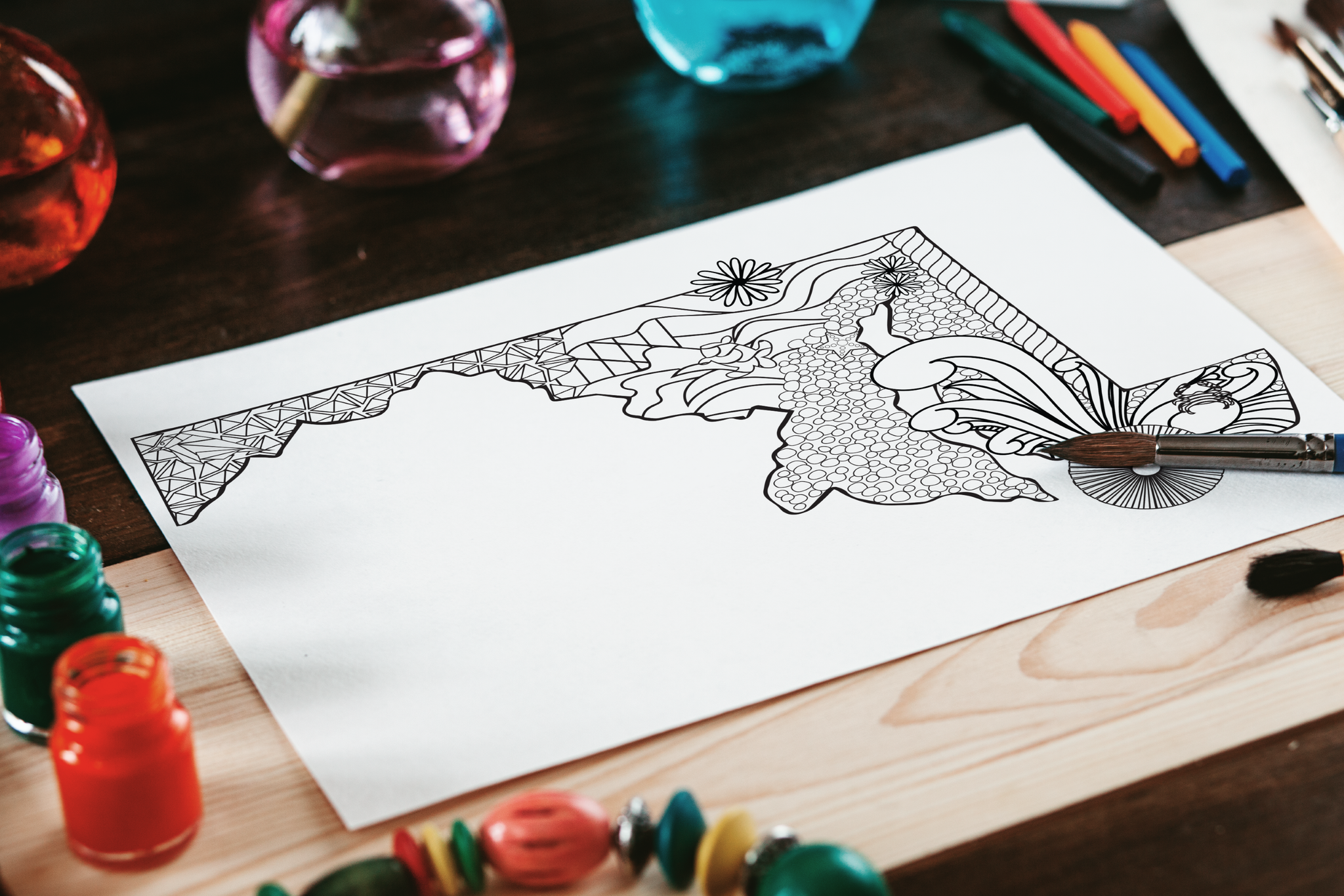 From the Appalachian Mountains to the Coastal Plain, Maryland is re-envisioned here as an homage to all of "mini-America" in one fabulous coloring page.